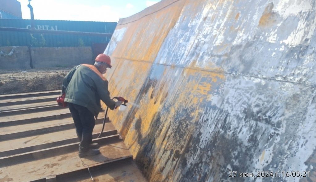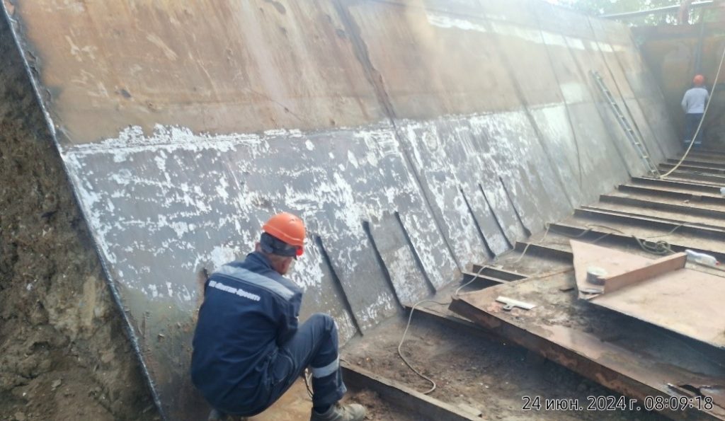 Работы г. Речицы (Фарфоровый завод) с 24.06.2024 по 30.06.2024 Произведенные работы: — Очистка поверхности щётками, демонтаж торцевых стен и борта; — Обработка металлических поверхностей стен преобразователем ржавчины; — Сварка днища емкости листами Ст.3 1500*6000мм.
