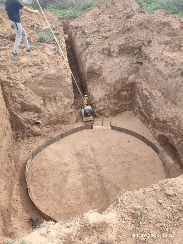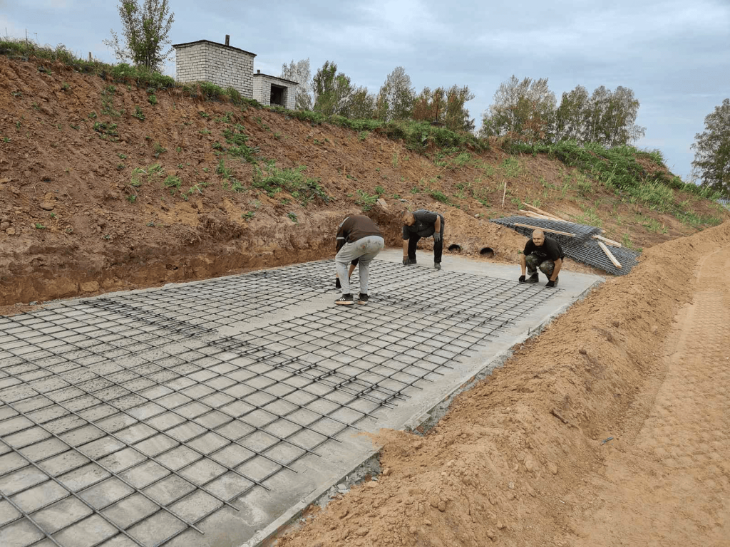 - Обвязка арматурного каркаса монолитного фундамента песколовок.