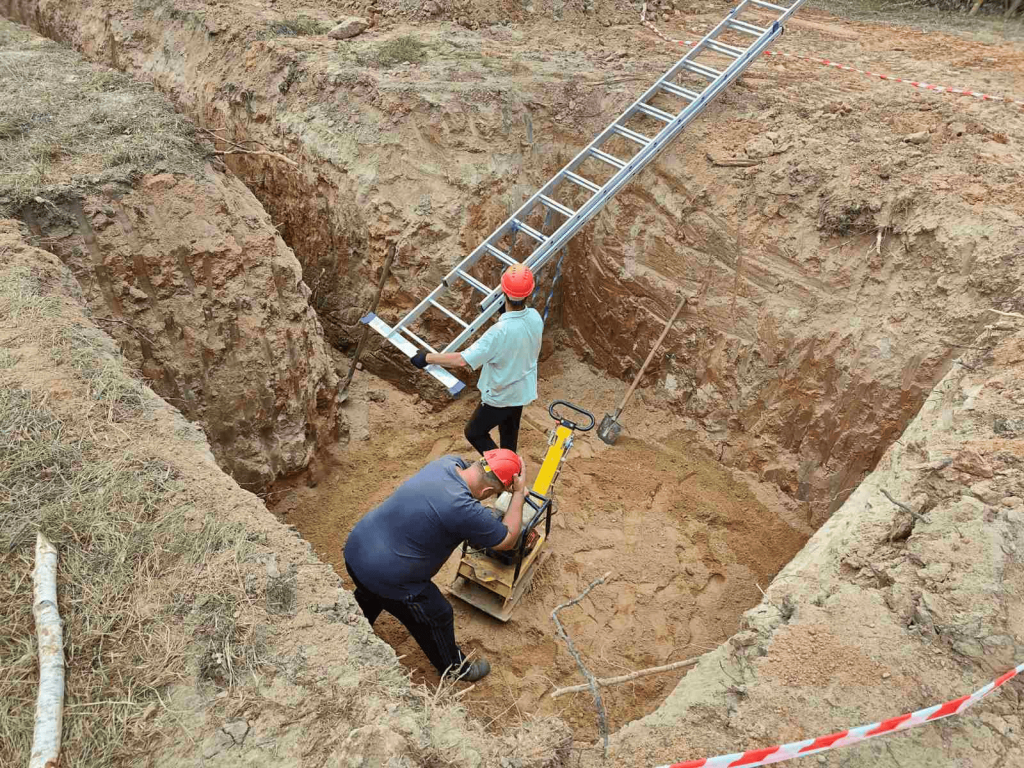 - Уплотнение песчаной подушки бензовибротрамбовками.